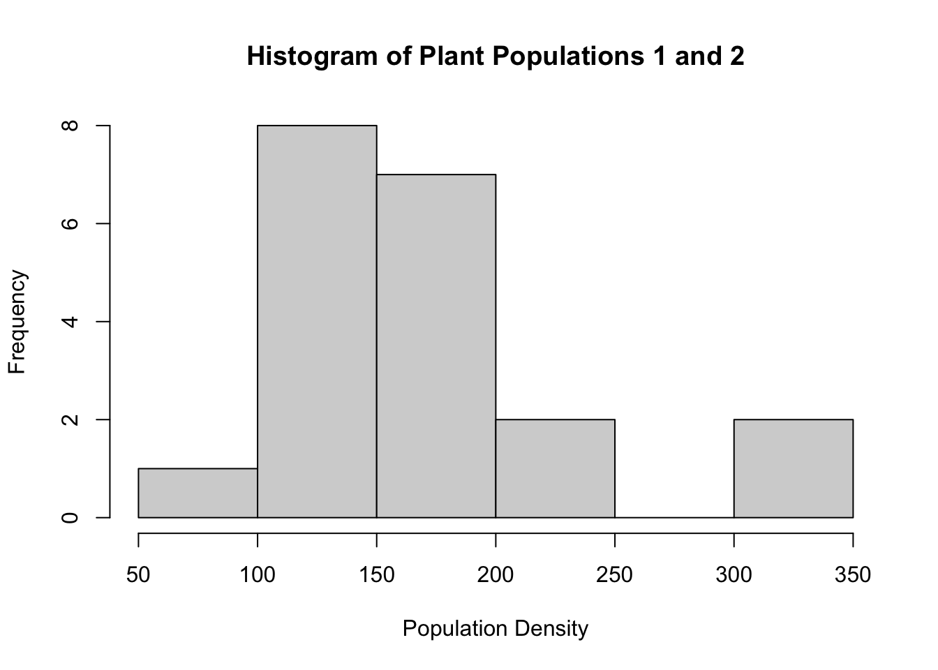 main = paste("Histogram of Plant Populations 1 and 2"),